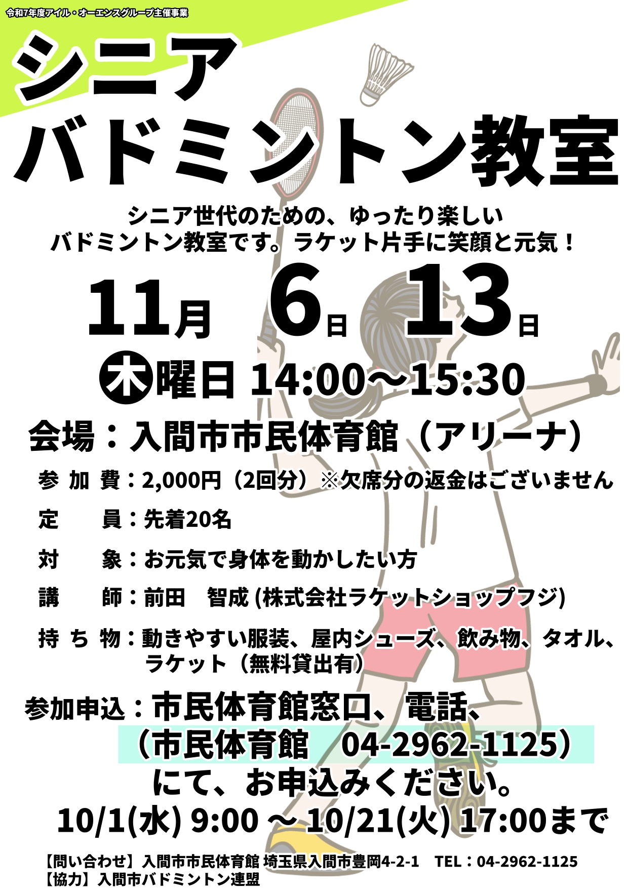 10/1お申込みスタート【11月開催 シニアバドミントン教室】11/6・11/13(全2回)