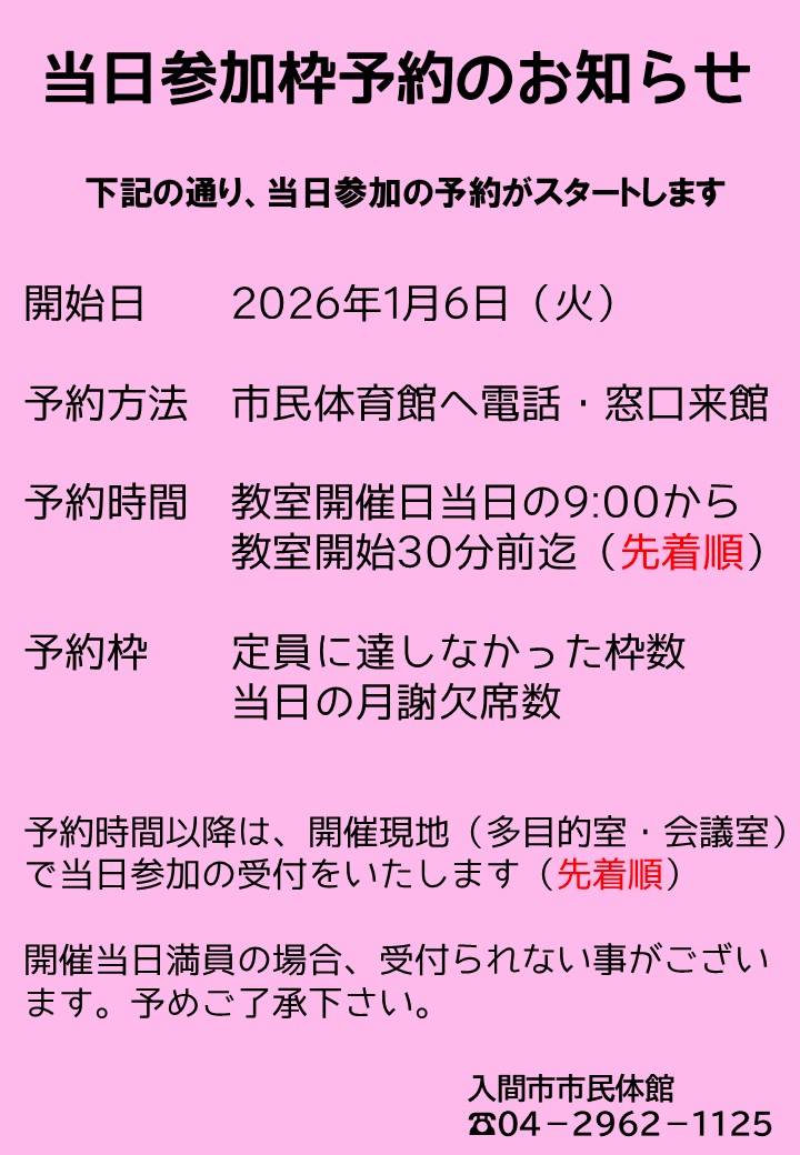 また教室開始時間の15分前からは、今まで通り現地で受付します。(先着順)
