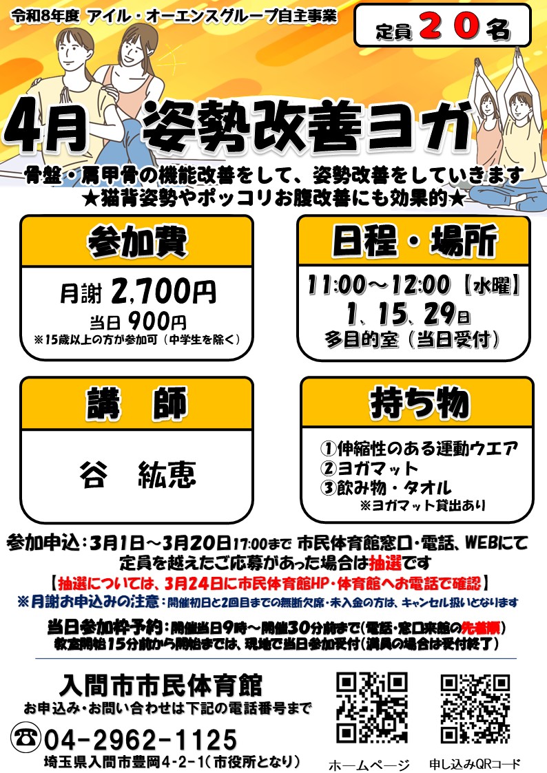 4月開催「姿勢改善ヨガ」申込み開始!