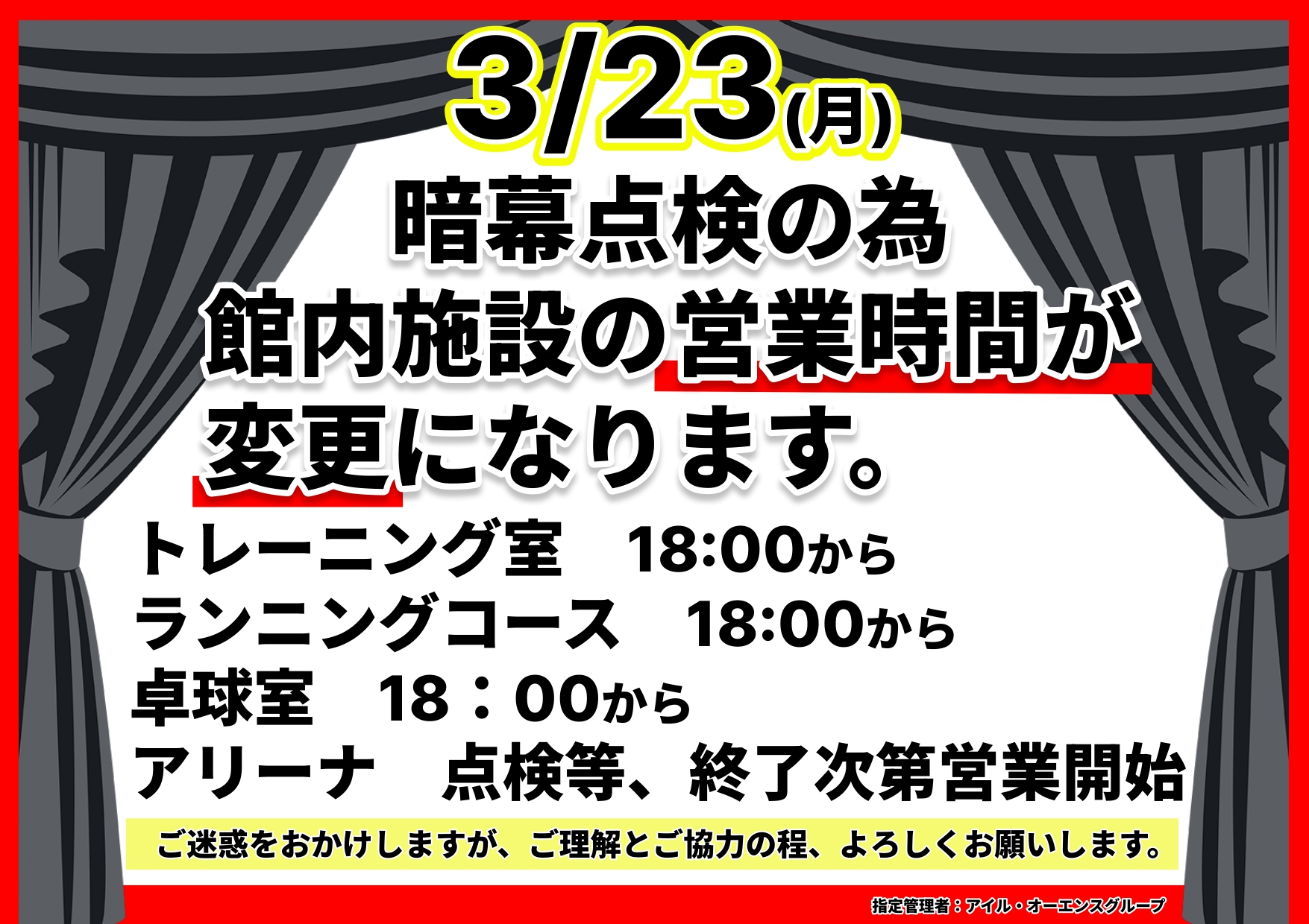 3/23(月)暗幕点検の為、市民体育館一部施設の営業時間が変更になります。