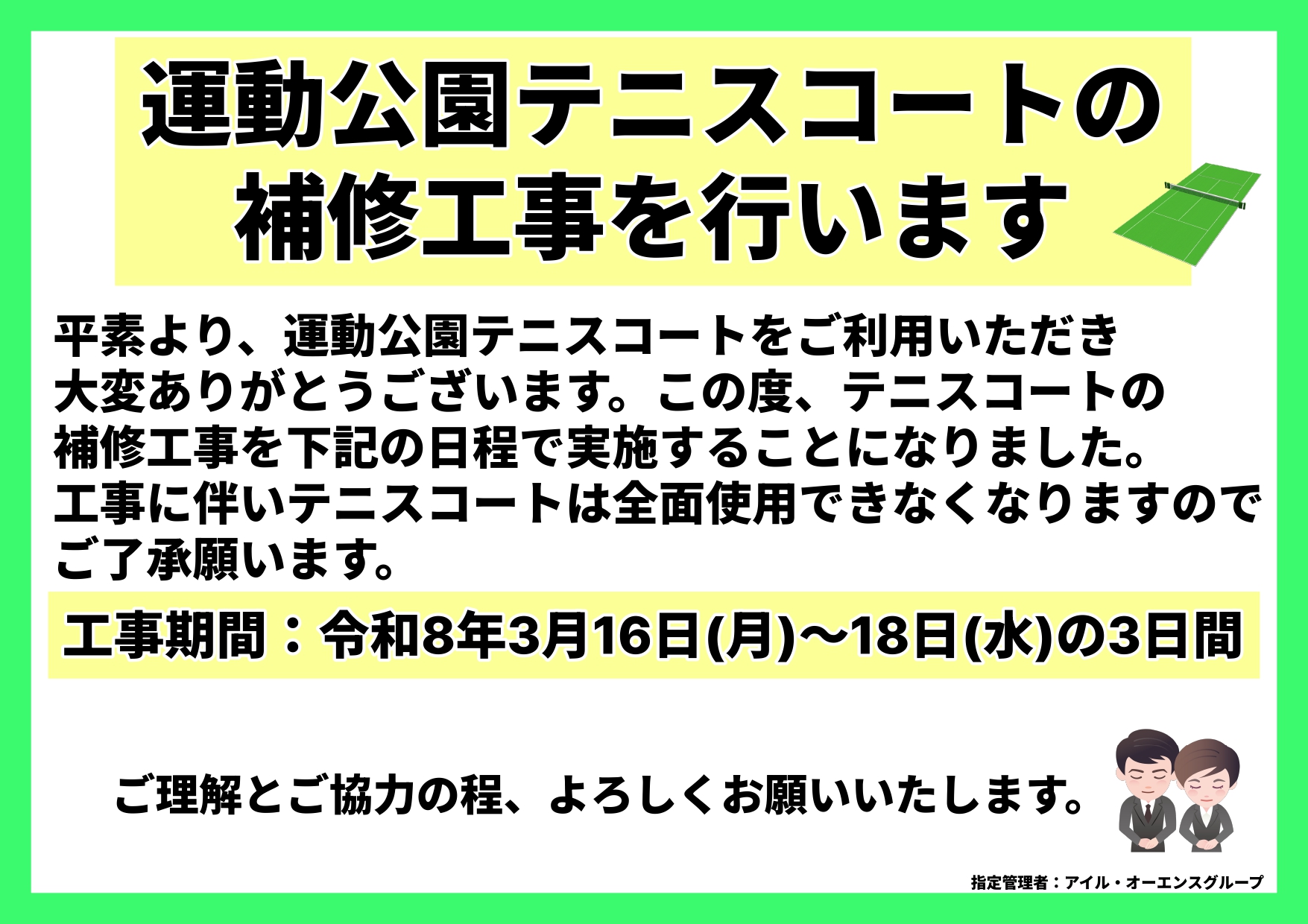 令和8年 3/16(月)~3/18(水)運動公園テニスコート補修工事のお知らせ