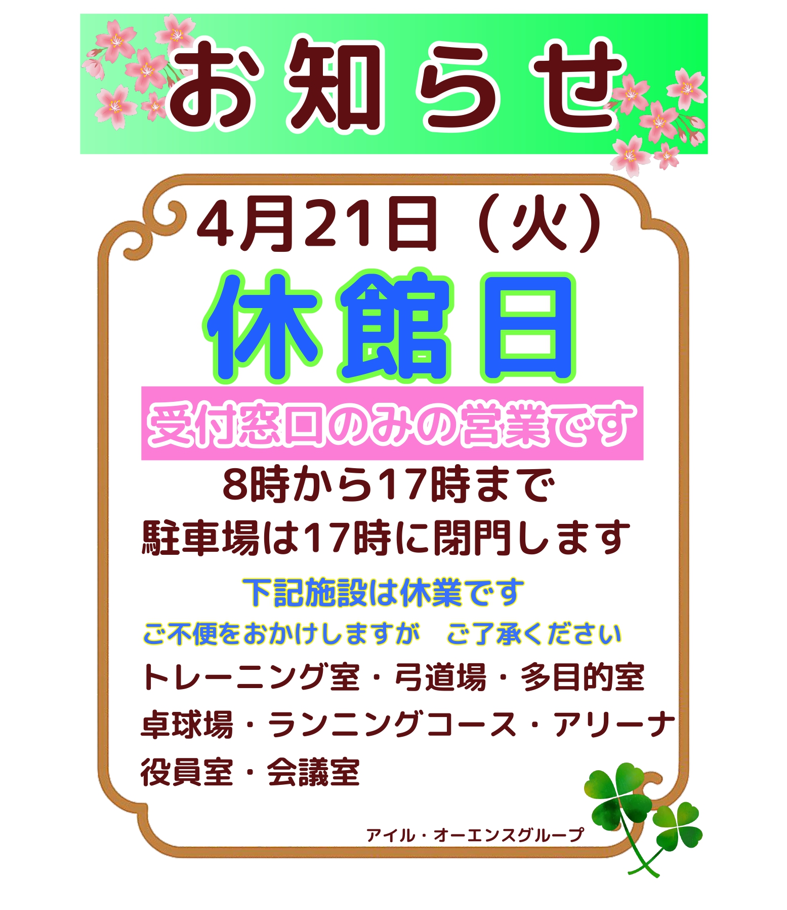 4/21(火)市民体育館休館日のお知らせ