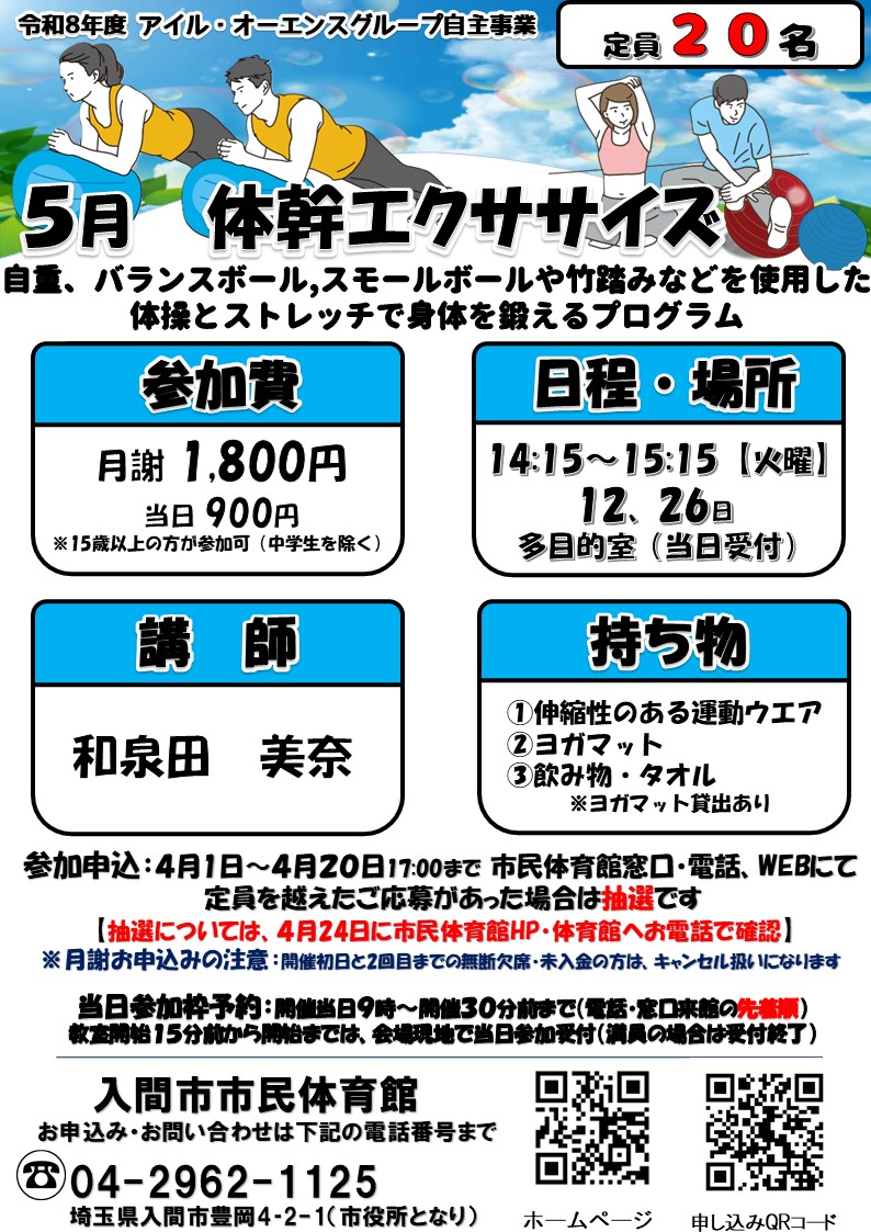 5月開催「体幹エクササイズ」申込み開始!