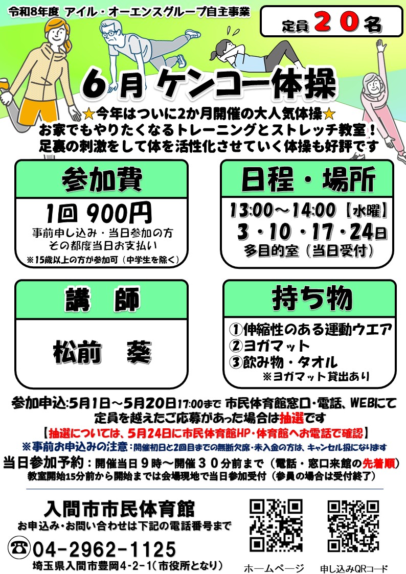 5月1日 9:00より 6月開催『ケンコー体操』の申込が始まります!
