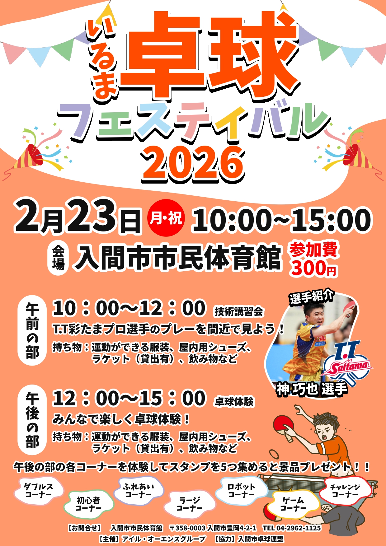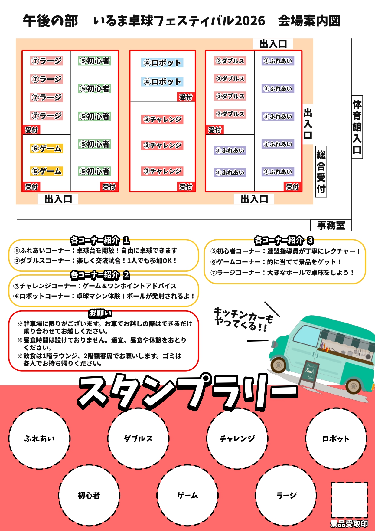 幅広い世代に大人気の体験型卓球イベントを開催します! 午前は世界レベルで活躍したトップアスリートを講師に招いた技術講習会を行います。 圧巻のプレーを間近で見られるチャンスです。技術講習会後にはサイン会もあります。 午後は7つの体験コーナーをめぐるスタンプラリーをお楽しみください。 お昼はキッチンカーも来るので、1日楽しめます! 館内履きを忘れずにお持ちください。