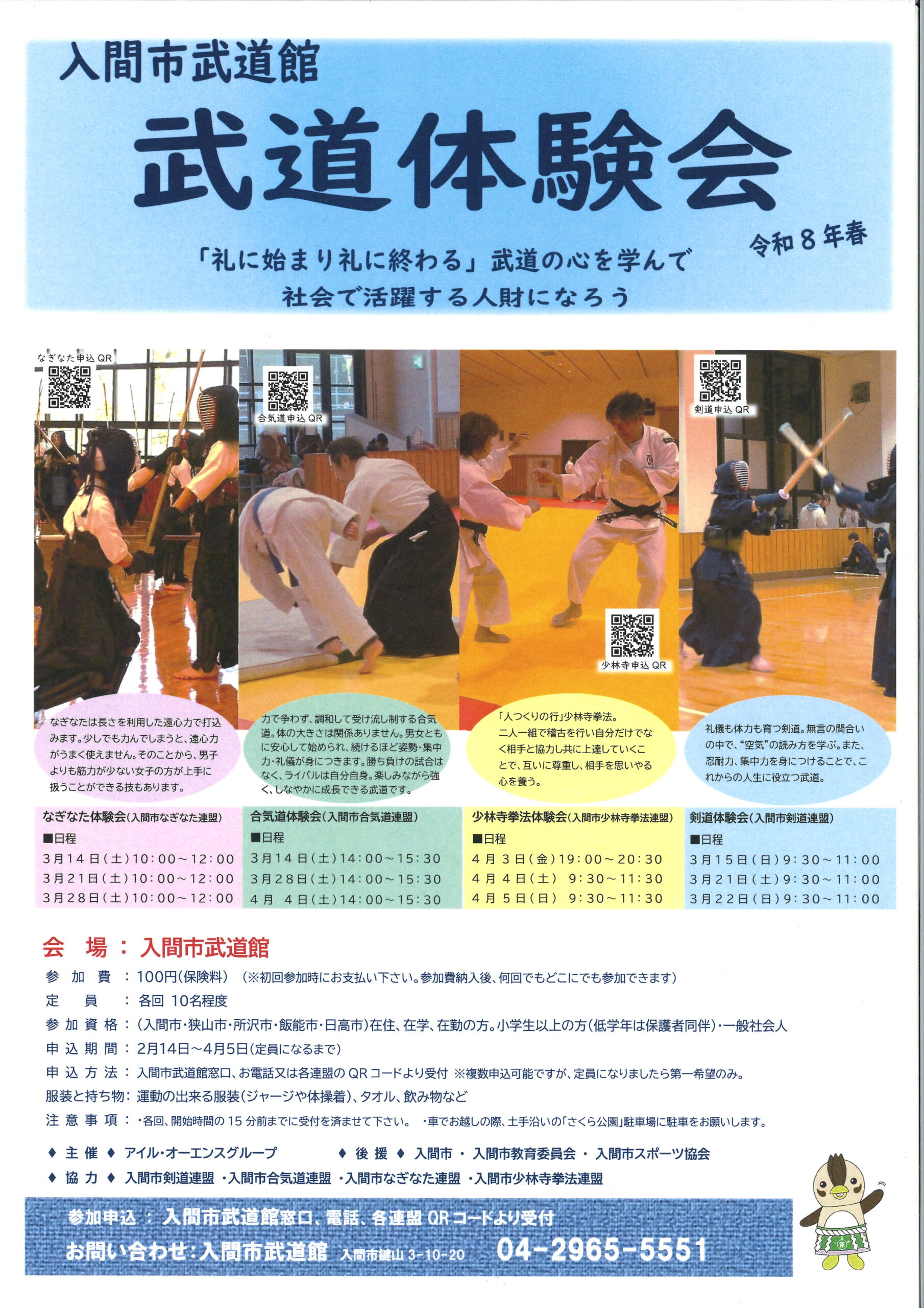なぎなた、合気道、少林寺拳法、剣道の武道体験会が武道館で開催します。