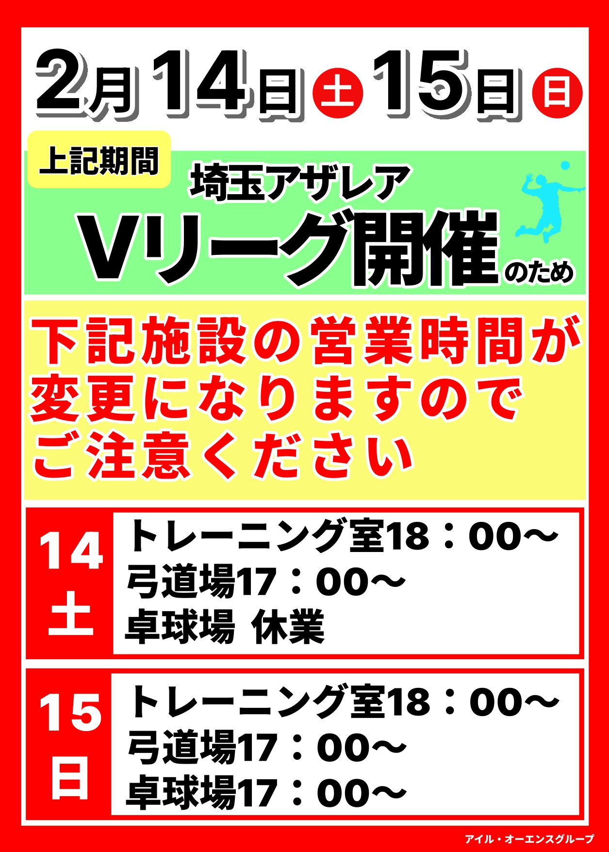 2月14日、15日は市民体育館アリーナにてVリーグが開催されるため、一部館内施設の営業時間が変わります。ご理解の程よろしくお願いします。
