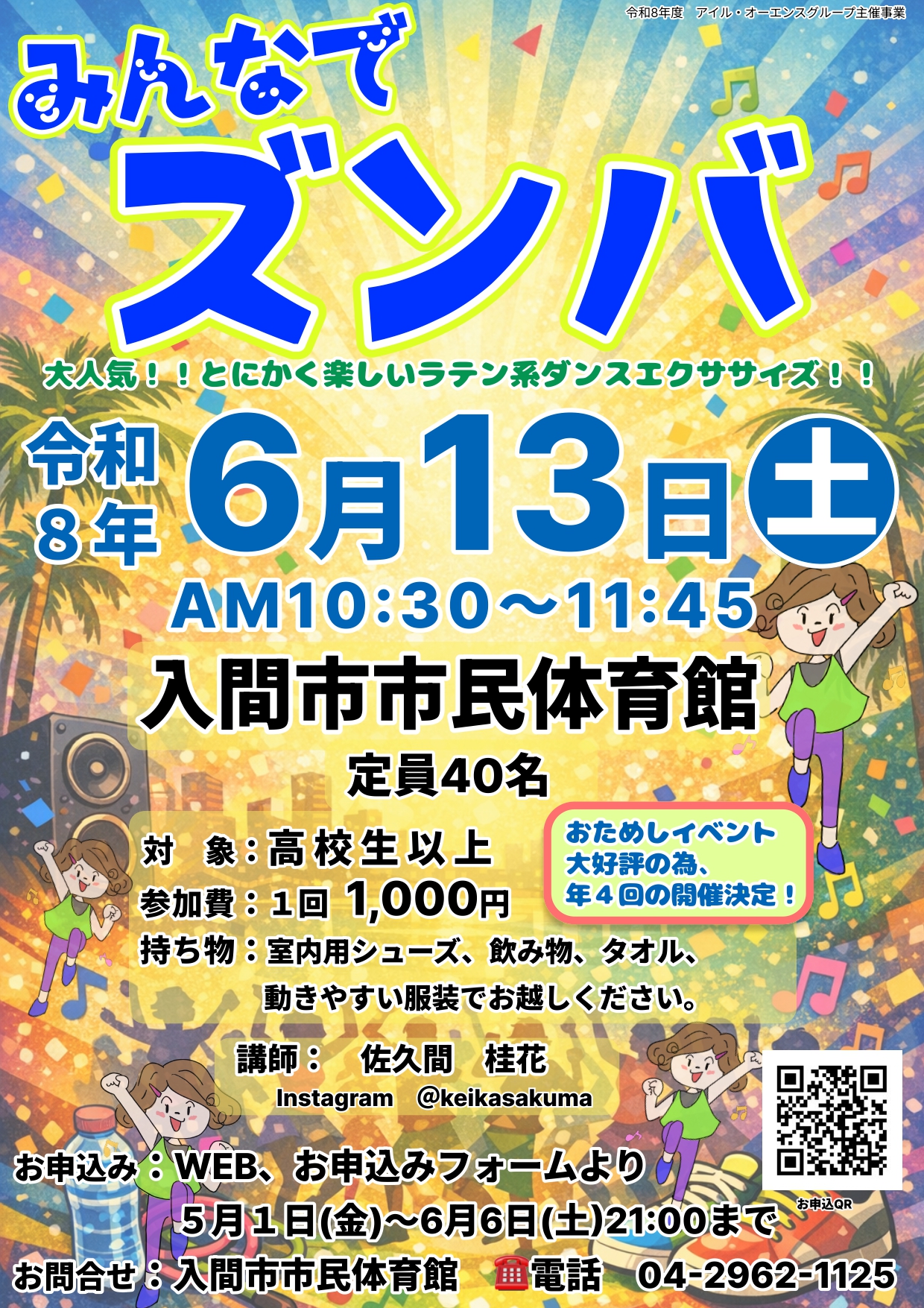 おためし企画で大好評!! 年4回のズンバイベントが開催決定いたしました!! 第1回目は6月13日(土)10:30~11:45 みんなで盛り上がりましょう!!