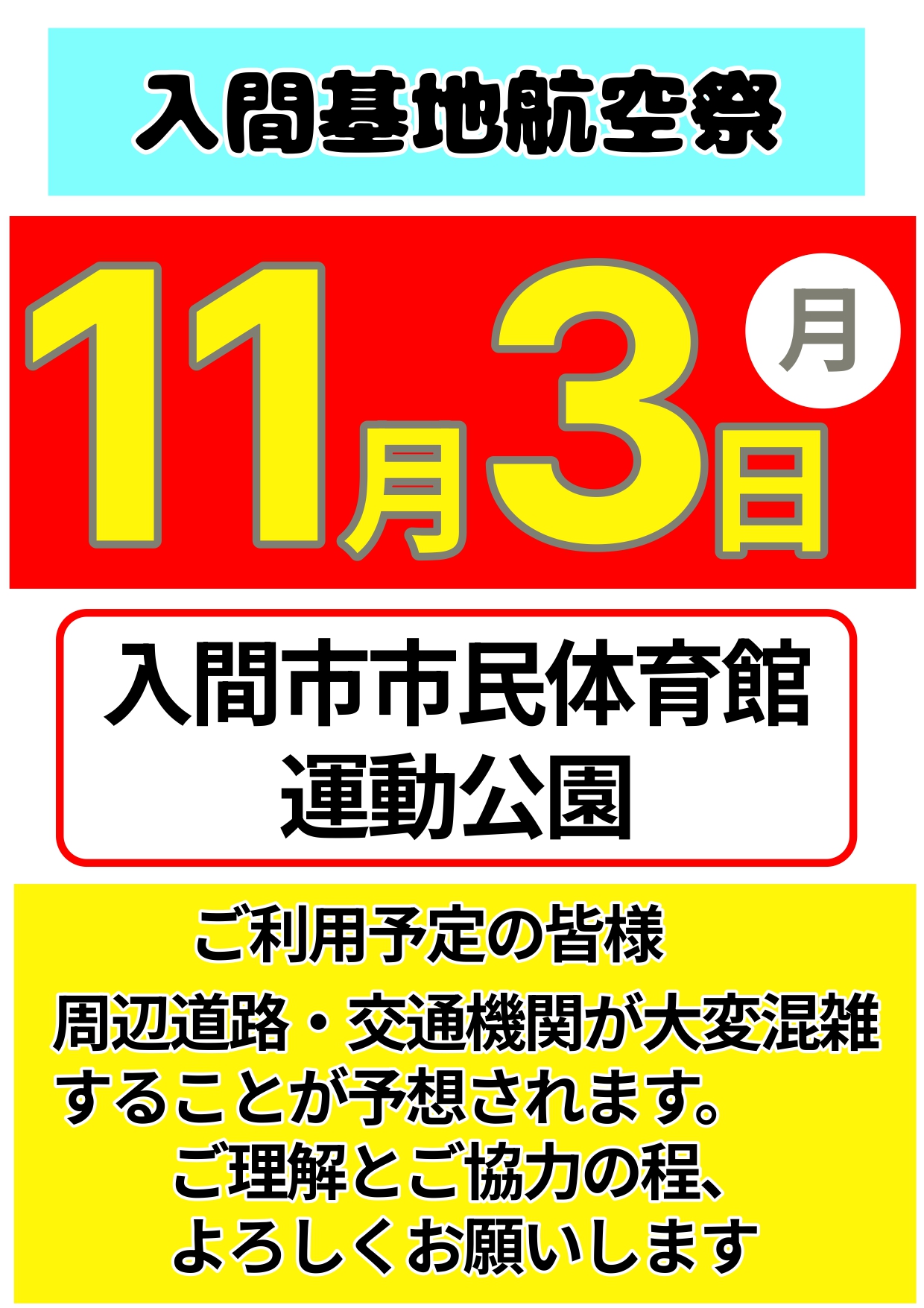 市民体育館の駐車場は利用者様以外の駐車を固くお断りします。(許可書の受け取りなど短時間の入場は可能です) 例年、無理に市民体育館に駐車しようとする車が押し掛けることで周辺道路に大渋滞を招き 体育館利用者が体育館にたどり着けない、近隣の皆様に多大なご迷惑をかけてしまうということが 起こっています。どうか、お考え下さい。 ご理解とご協力の程、よろしくお願いします。