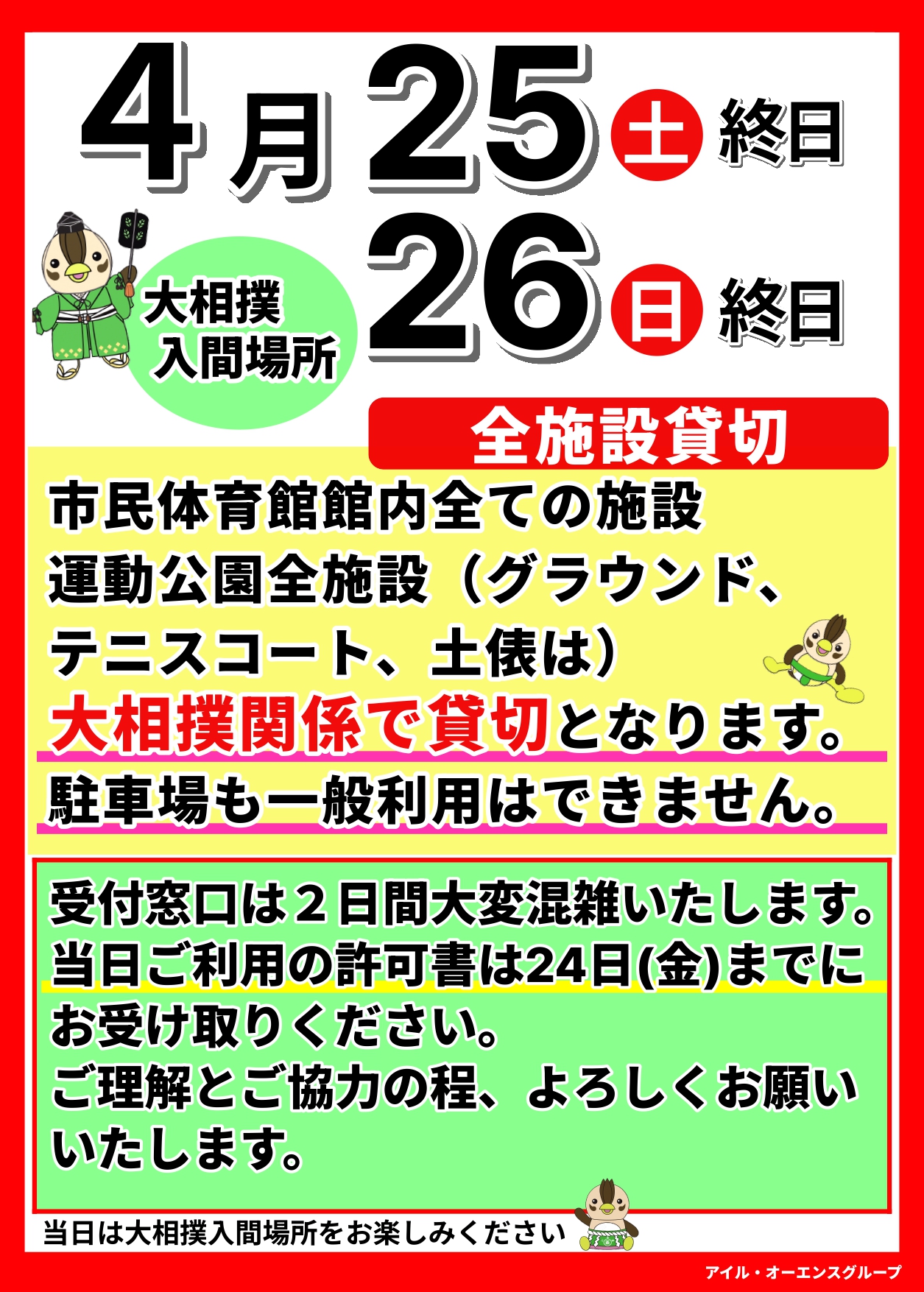 4/24(金)~4/27(月)まで市民体育館及び、運動公園全施設は貸し切りとなるため、
