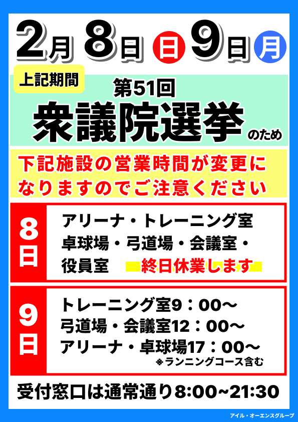 2/8(日)市民体育館は衆議院選挙の開票所となるため休館します。 2/9(月)も片付けの為、営業時間が変更になる施設があります。 ご理解とご協力の程、よろしくお願いいたします。