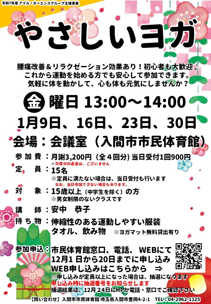 12月1日 9:00より 1月開催『やさしいヨガ』の申込スタート!
